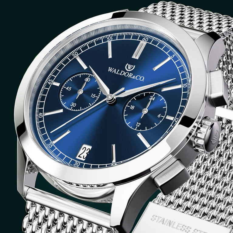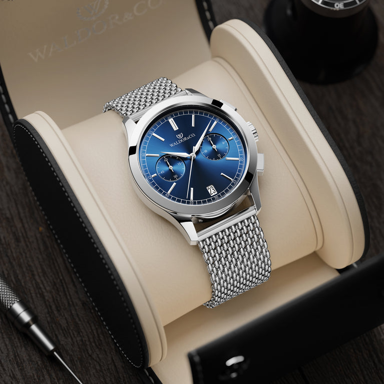 The striking blue dial of the Chrono 39 Sardinia is reminiscent of the crystal-clear waters of Sardinia, a nod to the exclusive and serene spirit of the Mediterranean. This particular blue is vibrant yet deep nuance, designed to catch and play with the light in a way that mimics the sun's reflections off the ocean's surface.