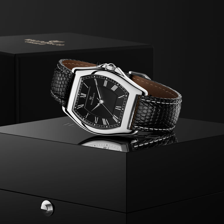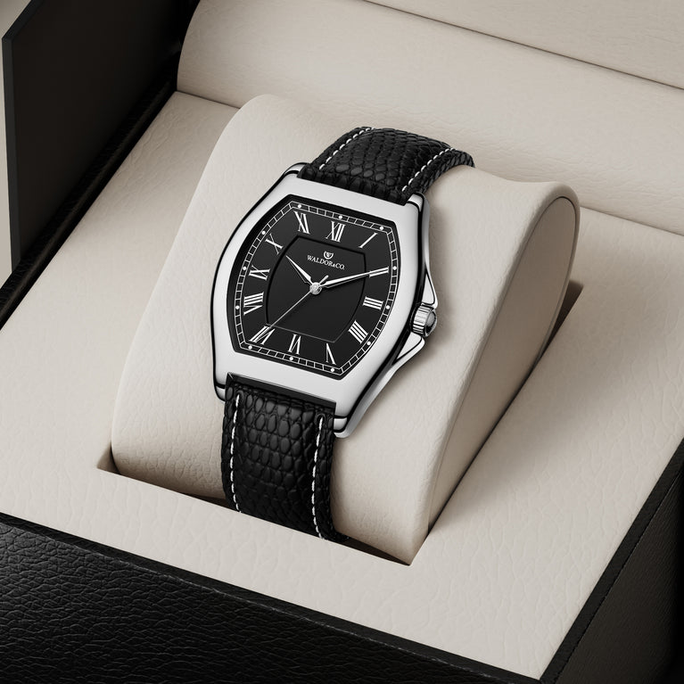Strap: Genuine black leather with seam details